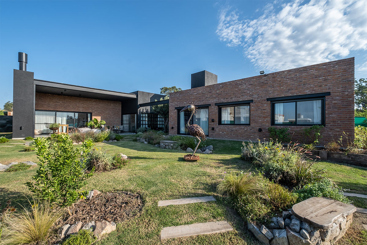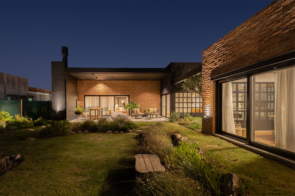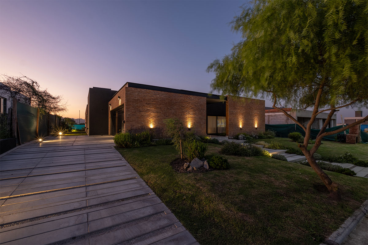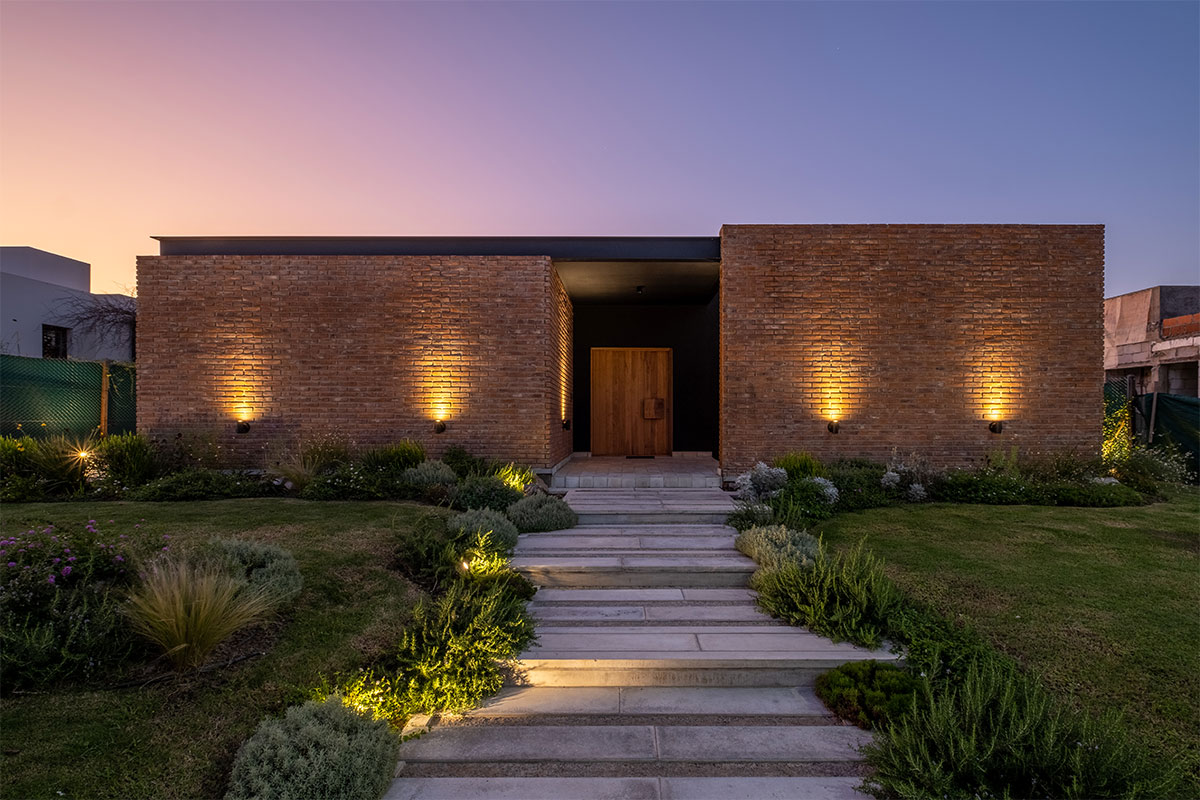 La morfología es simple y austera cerrándose hacia lo público y abriendo todas sus envolventes al jardín interior. Se eligió el ladrillo visto como material predominante, abrazado con un gran perfil negro que provoca el diálogo entre el afuera y el adentro. El ingreso peatonal nos recibe con un patio seco a la derecha que logra conservar la intimidad del hogar.