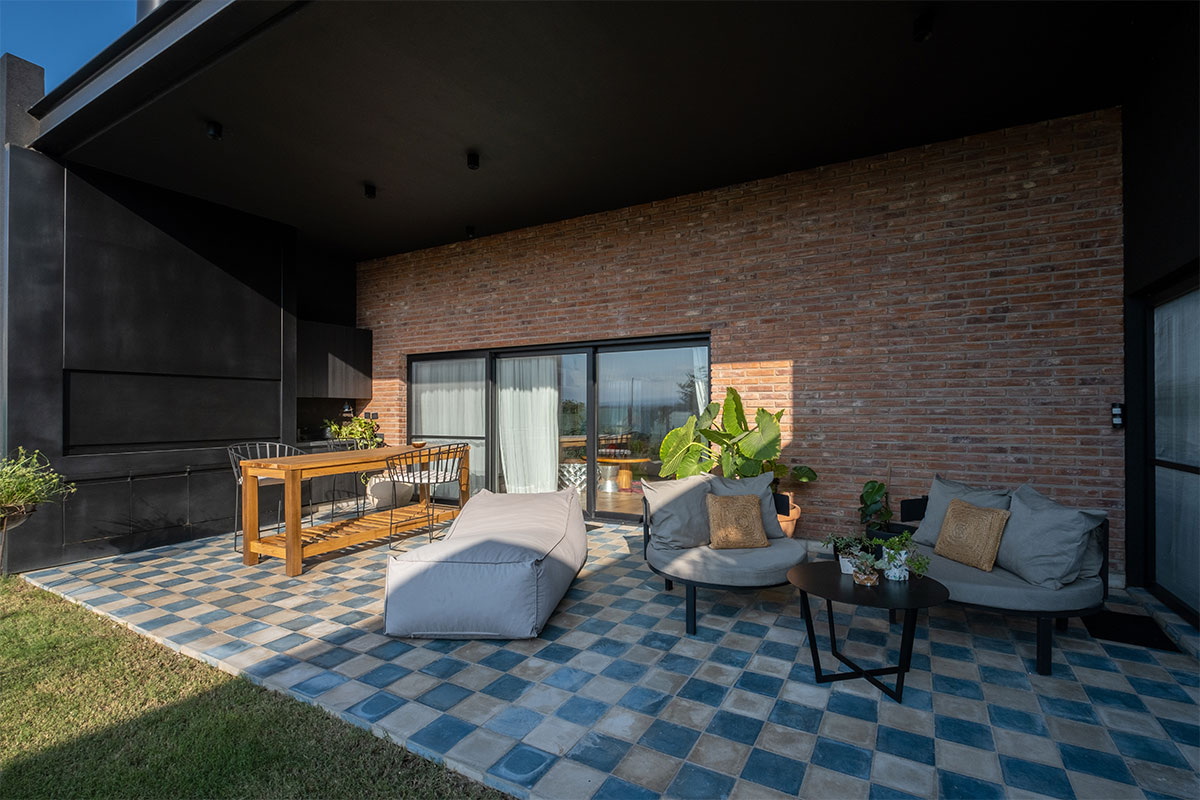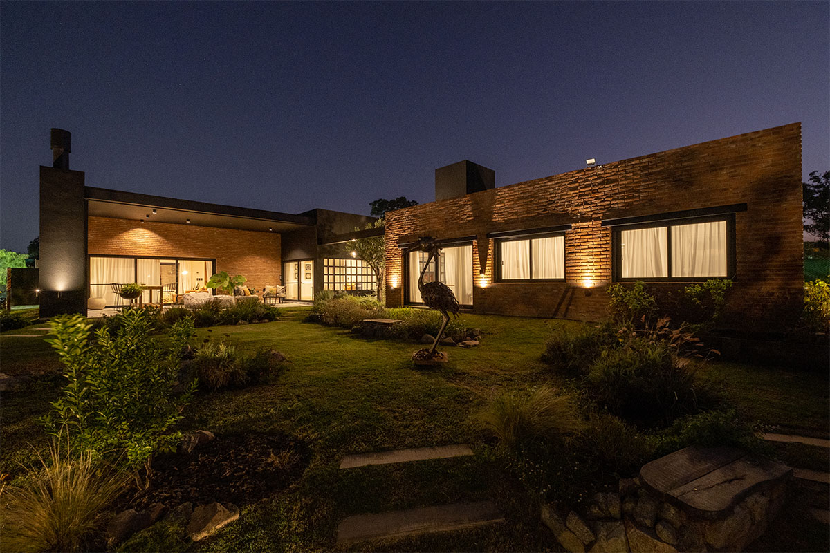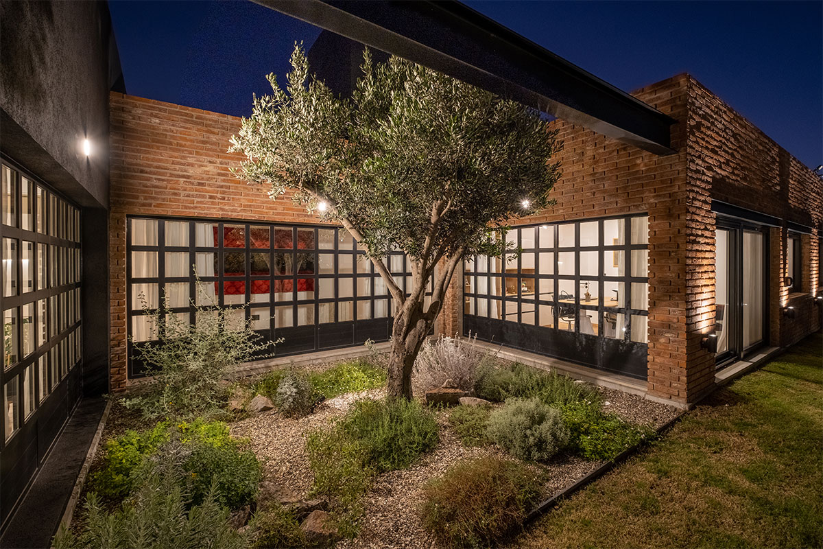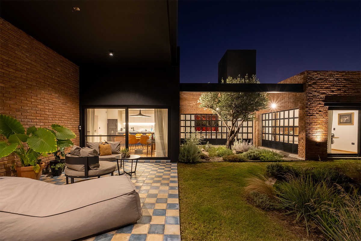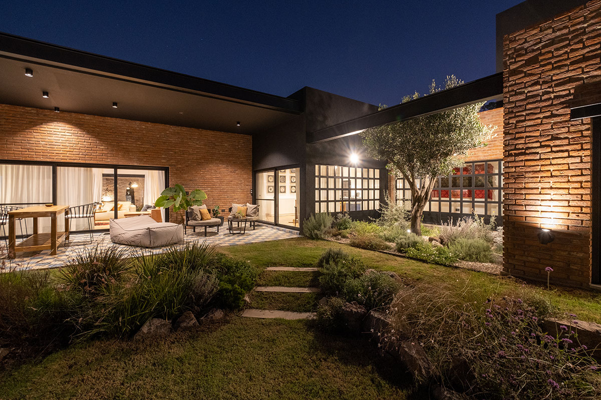 La morfología es simple y austera cerrándose hacia lo público y abriendo todas sus envolventes al jardín interior. Se eligió el ladrillo visto como material predominante, abrazado con un gran perfil negro que provoca el diálogo entre el afuera y el adentro. El ingreso peatonal nos recibe con un patio seco a la derecha que logra conservar la intimidad del hogar.