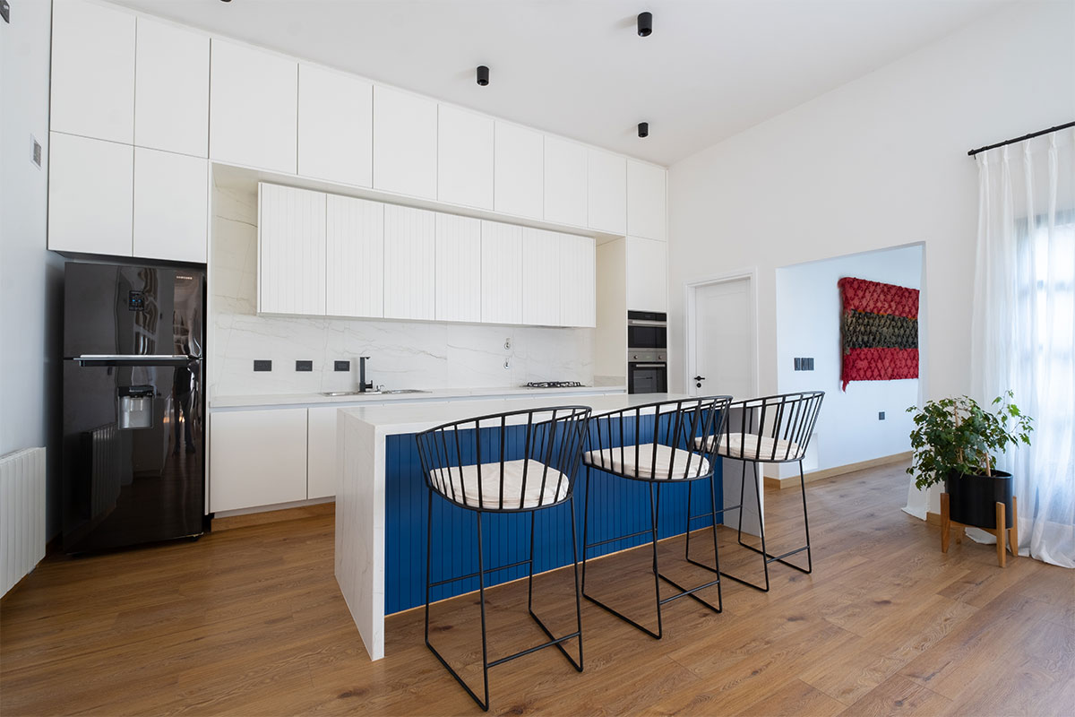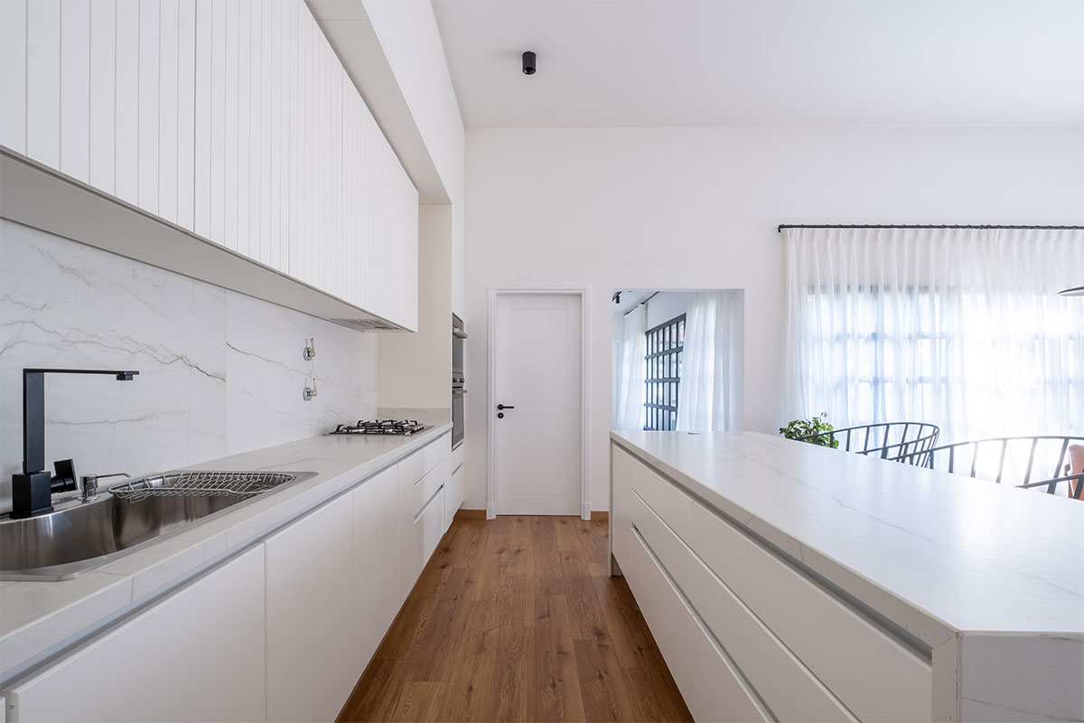 La casa nos invita a seguir hundiéndonos en ella, llegando a su corazón, la amplia cocina que se levanta etérea y vibrante. Desde ella ya podemos emocionarnos con el suave tronco del olivo.